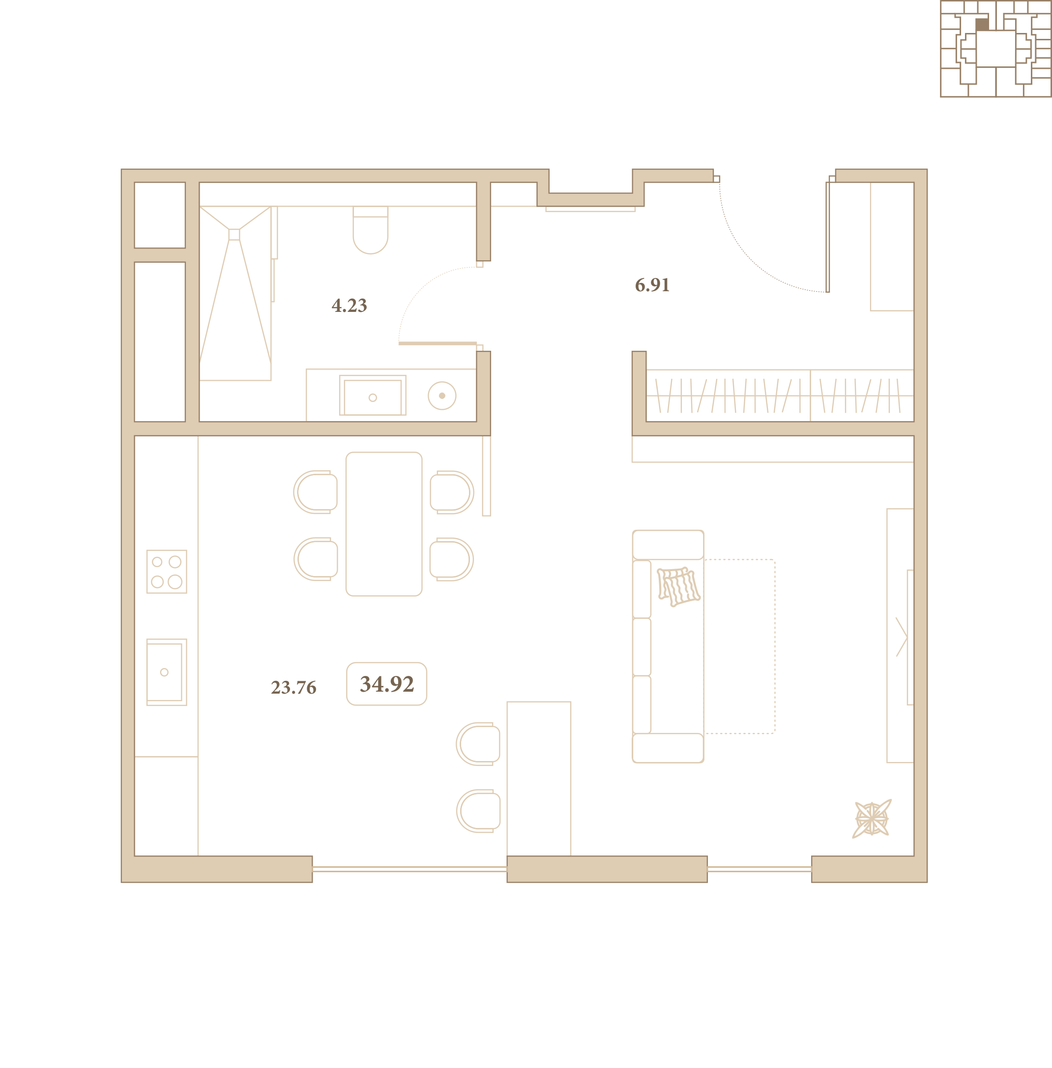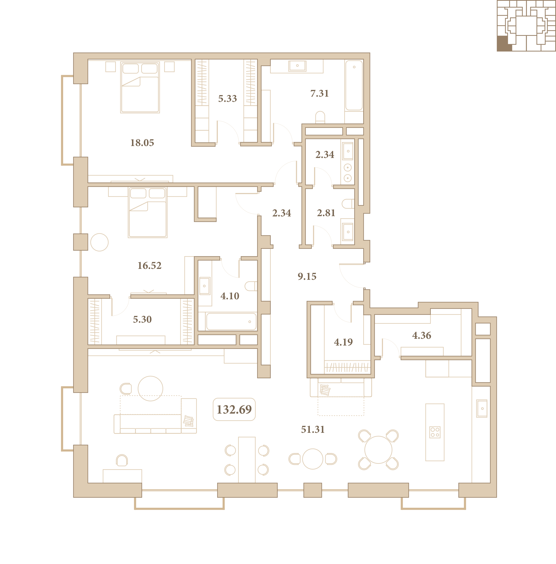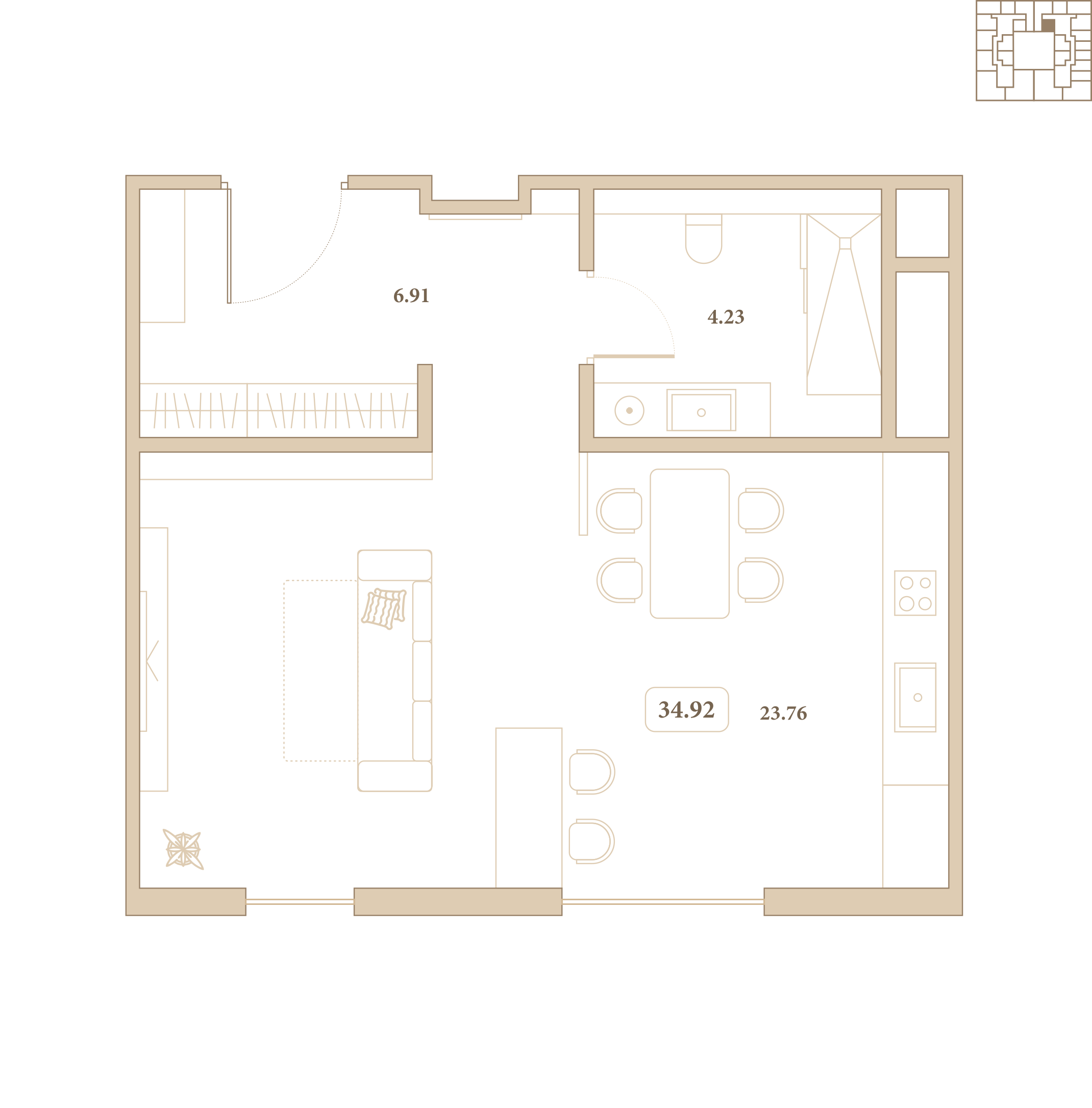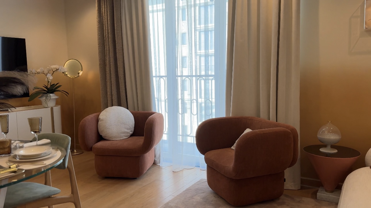 Отделка выполнена из высококачественных материалов, а каждый элемент интерьера подчёркивает стиль и гармонию пространства. Из окон открываются живописные виды на благоустроенный внутренний двор комплекса.