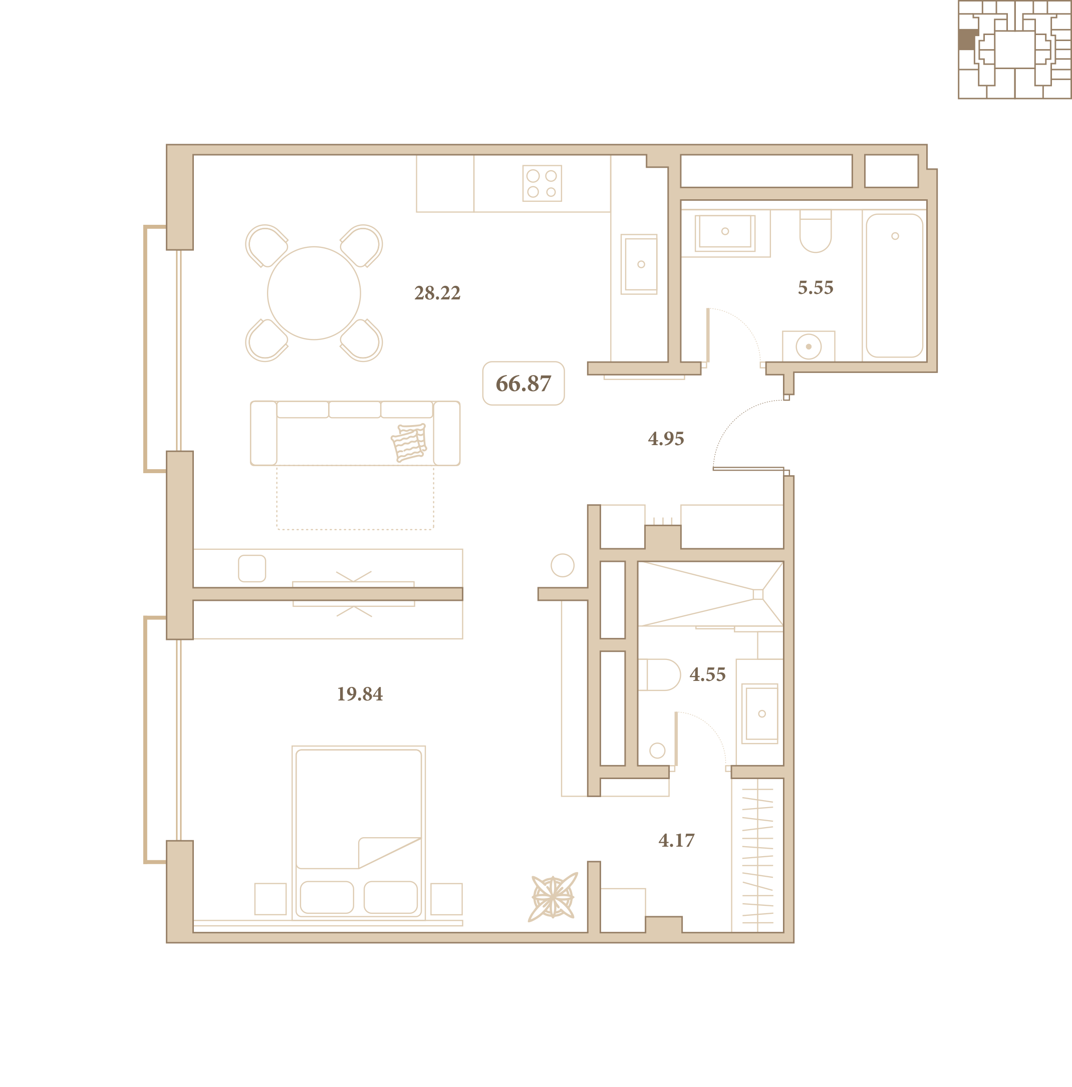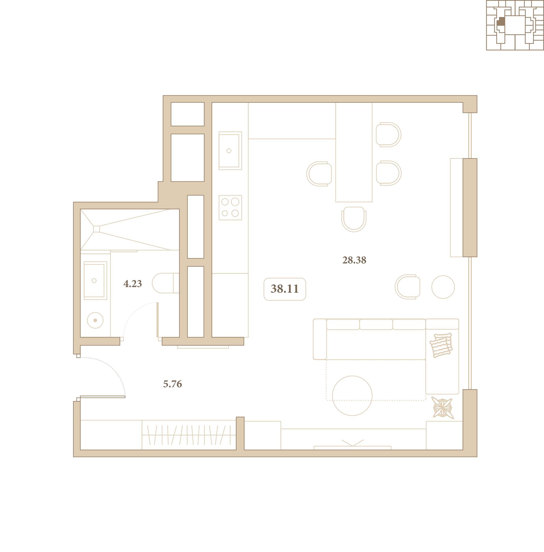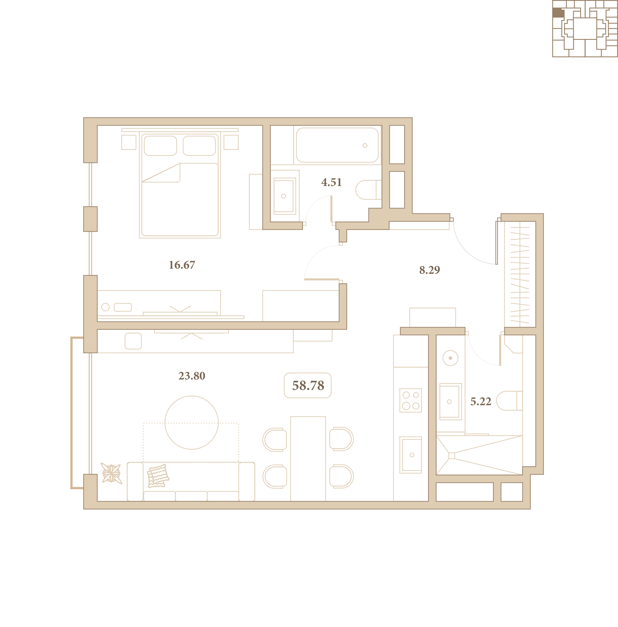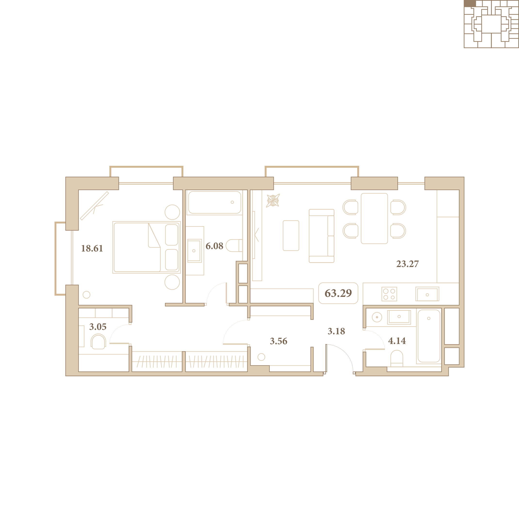 Отделка выполнена из высококачественных материалов, а каждый элемент интерьера подчёркивает стиль и гармонию пространства. Из окон открываются живописные виды на благоустроенный внутренний двор комплекса.